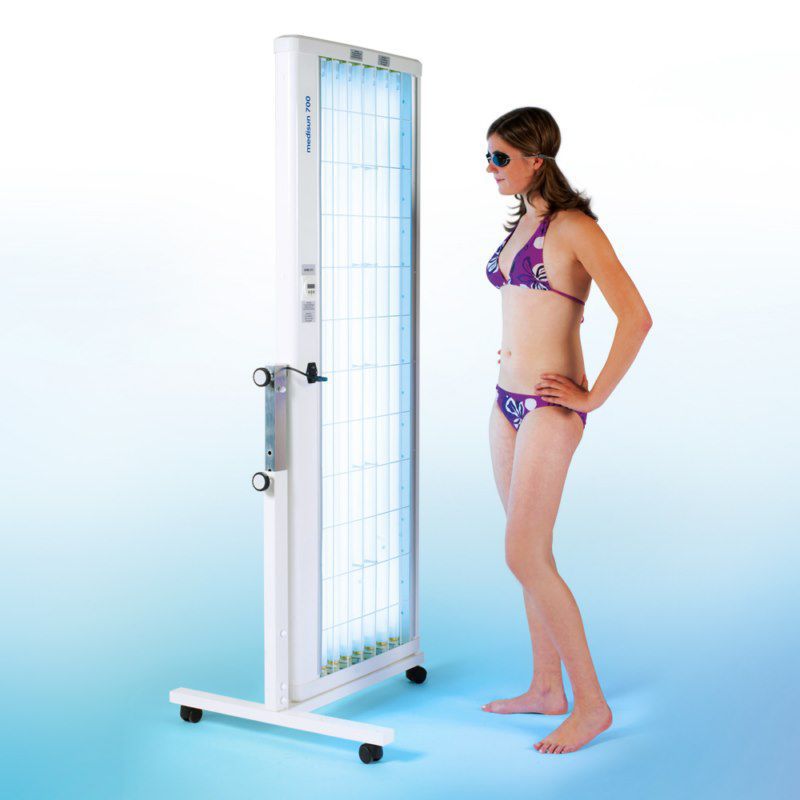 Thérapie corporelle intégrale à un prix avantageuxmedisun 700 est un appareil de thérapie à rayons UV à moindre coût pour le traitement du corps entier qui se caractérise par un encombrement considérablement réduit. Le traitement est effectué sur 180 cm de longueur en position allongée ou assise, ce qui est rendu possible grâce au trépied pivotant à hauteur réglable. Des durées d’exposition courtes et d’excellents résultats thérapeutiques sont ainsi garantis. Grâce à un équipement au choix avec différents spectres UVB et UVA, on peut éradiquer efficacement presque toutes les pathologies cutanées sensibles aux rayons UV. L’appareil n’a besoin que de de très peu d’espace et est fourni avec une prise Schuko standard de 230V.